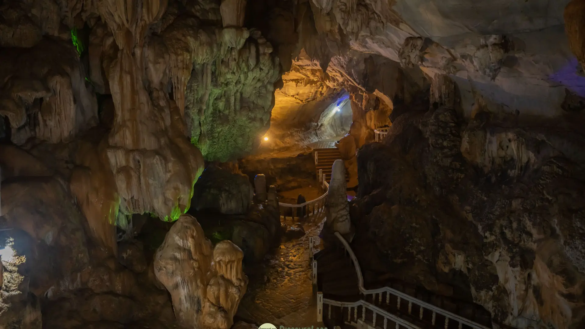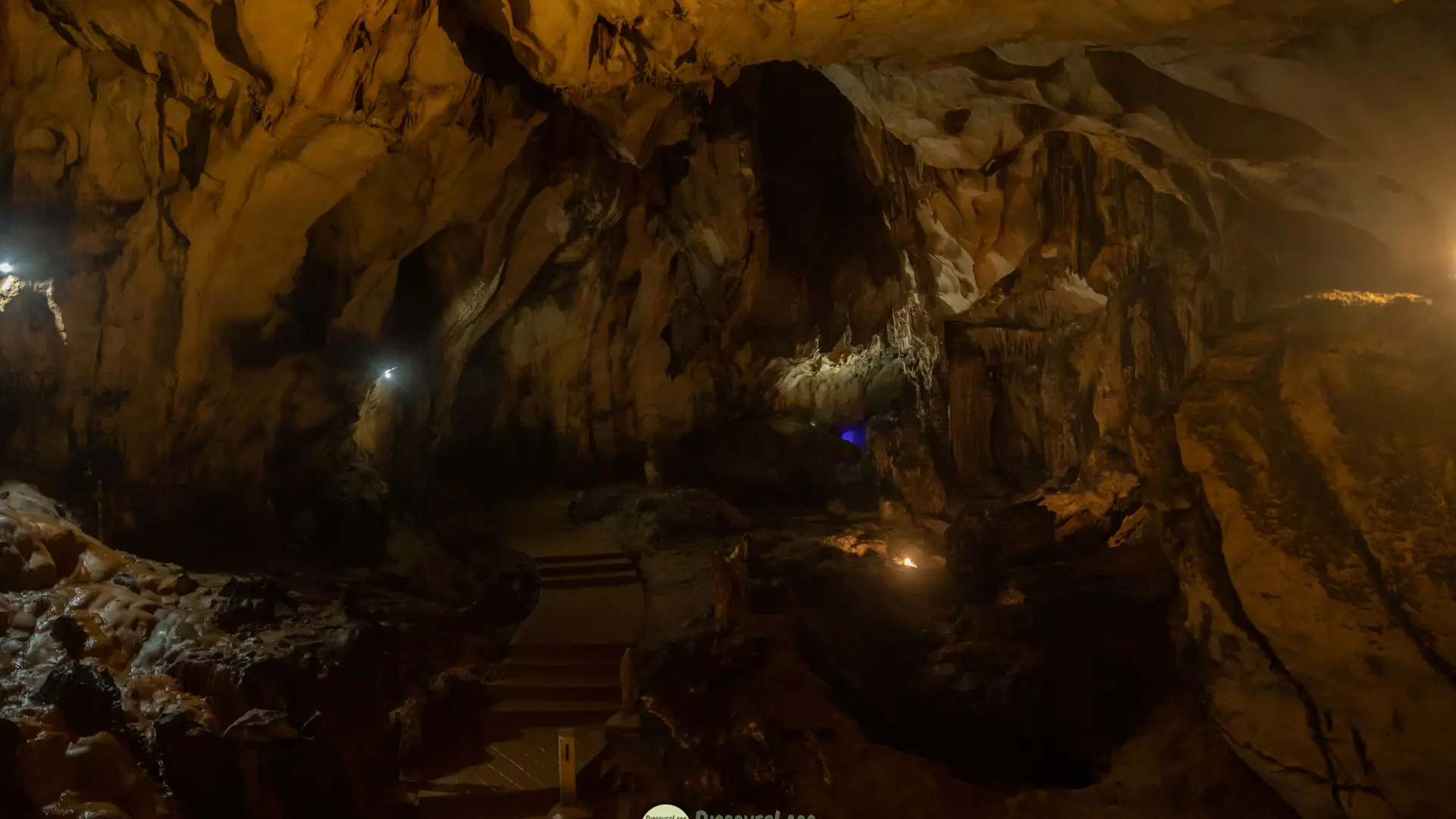 Note: Follow the river road south of Meuang Xong village. Pay the entrance fee at the gate of Vang Vieng Resort and cross the bridge over the Nam Xong to the steps leading up the cliff to Tham Chang.