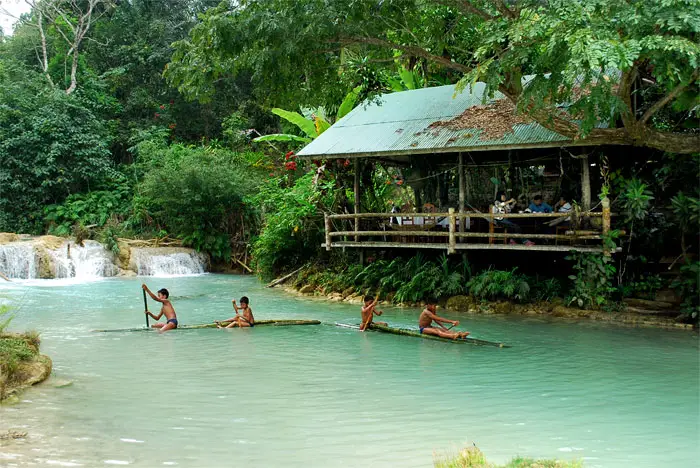 The list of activities include: cooking classes, mountain walks, a visit to the Kuang Si waterfalls and bear reserve and a fresh dip in the clear river.