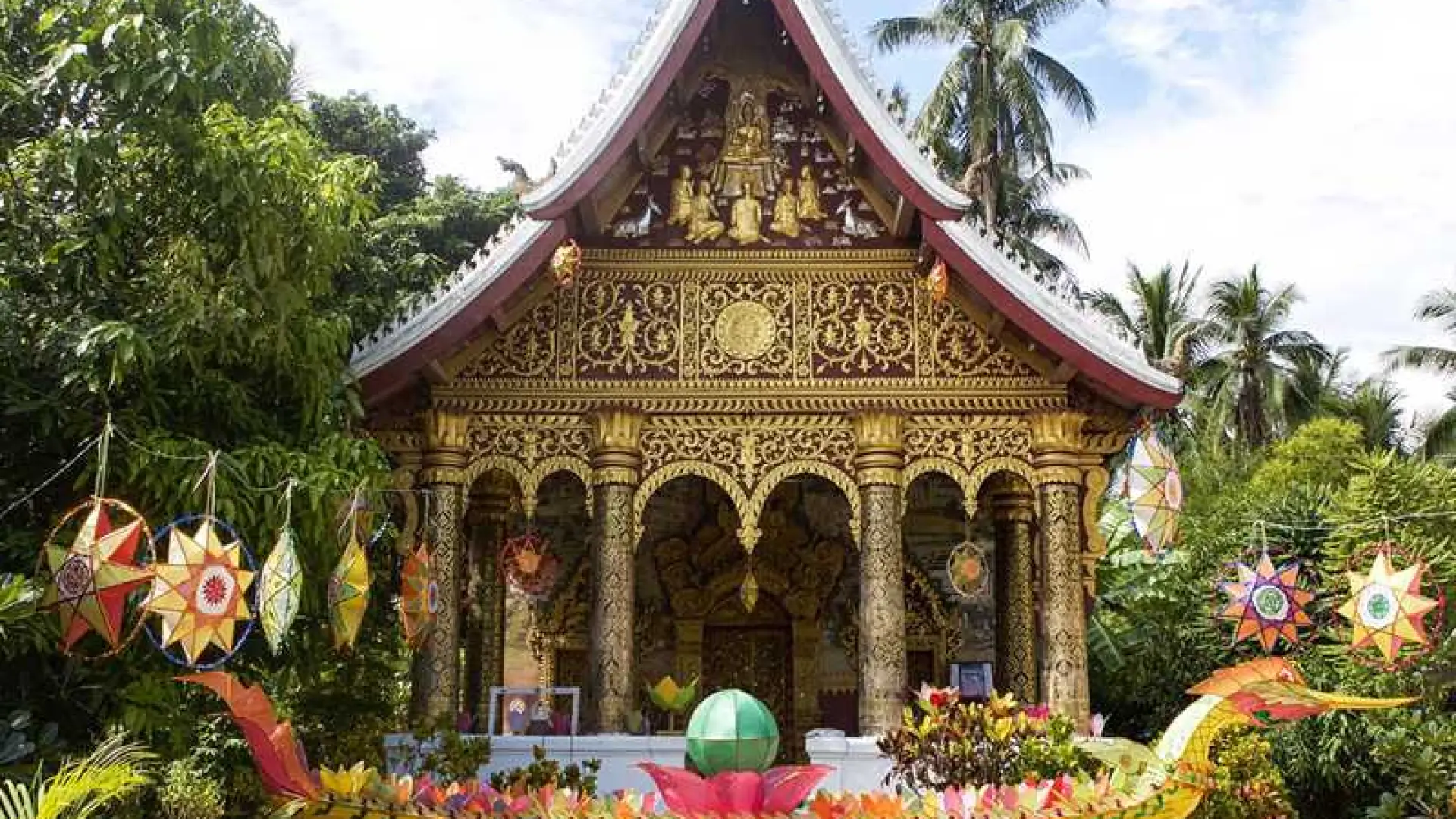 การตกแต่งของจำลองรวมถึงจิตรกรรมฝาผนังที่สง่างามเหนือทางเข้าหลักซึ่งแสดงฉากจากชีวิตของพระพุทธเจ้าพร้อมรายละเอียดที่ได้รับจากชีวิตในชนบทของลาวในศตวรรษที่ 19 ทางเข้าหลักของสิมนั้นปิดทองอย่างหรูหราด้วยหน้าบันคล้ายปราสาทที่ปิดทองด้วยแผ่นทองคำเปลวและประดับด้วยงานโมเสกแก้ว ด้านล่างเป็นแก้วหูอันน่าทึ่งที่มีนกยูงสามตัว สองตัวเป็นรูปโปรไฟล์และตัวหนึ่งมีลำตัวยื่นออกมาจากกรอบ . นี่อาจเป็นการอ้างอิงถึงปีนักษัตรของผู้บริจาค การปฏิบัตินี้เป็นเรื่องปกติในเอเชียตะวันออกเฉียงใต้และยังพบเห็นได้ที่วัดในเชียงใหม่ เช่น วัดพันเตา