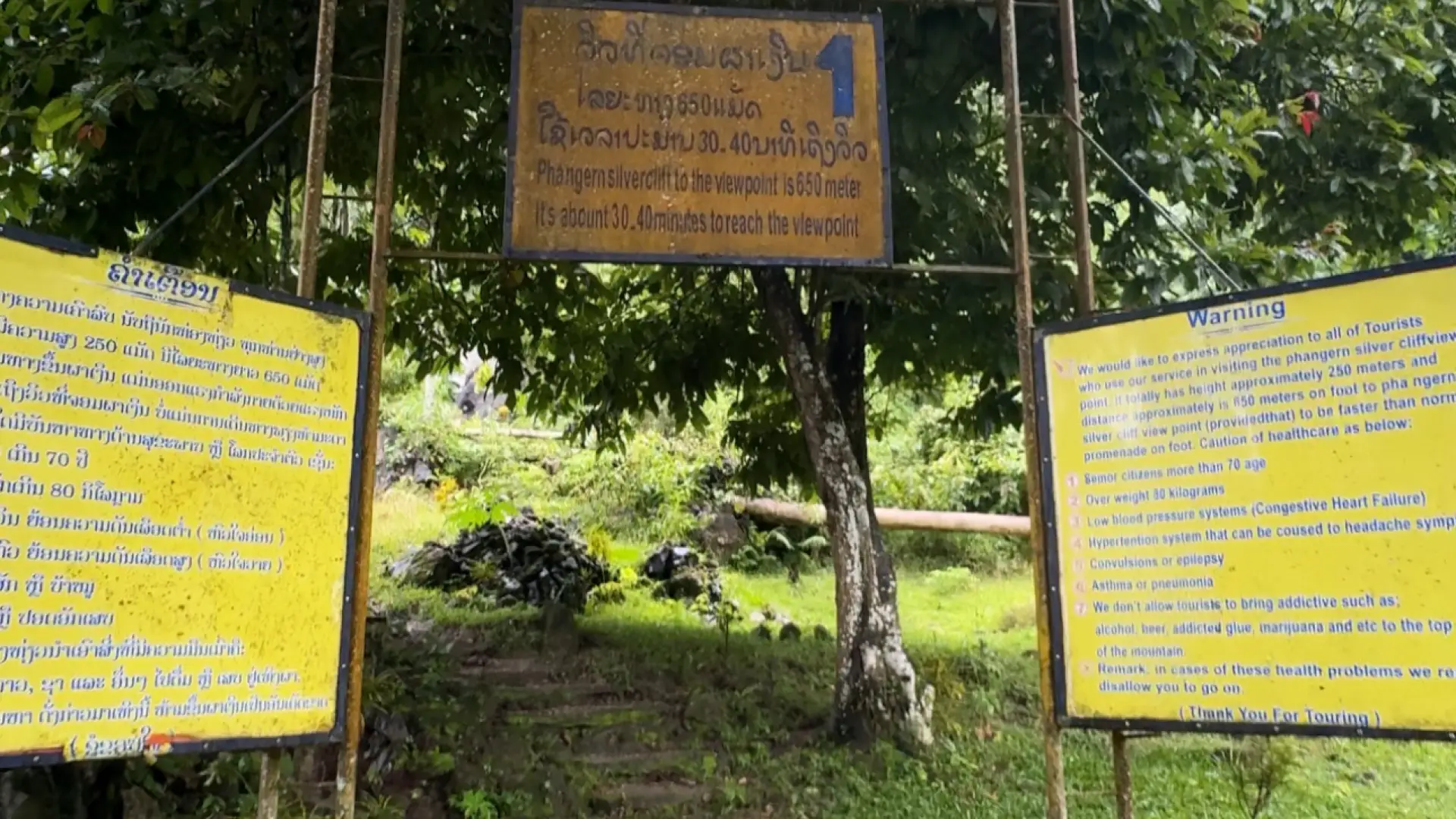 สถานที่ตั้ง: ข้ามน้ำซองในตอนใต้สุดของเมือง สะพาน Paradise Island ไป บ้านห้วยแย้ ไปตามถนนลูกรังประมาณ 4 กิโลเมตร จนถึงบ้านโพนเงินจากนั้นเดินขึ้นไปทางด้านบนของผาเงิน