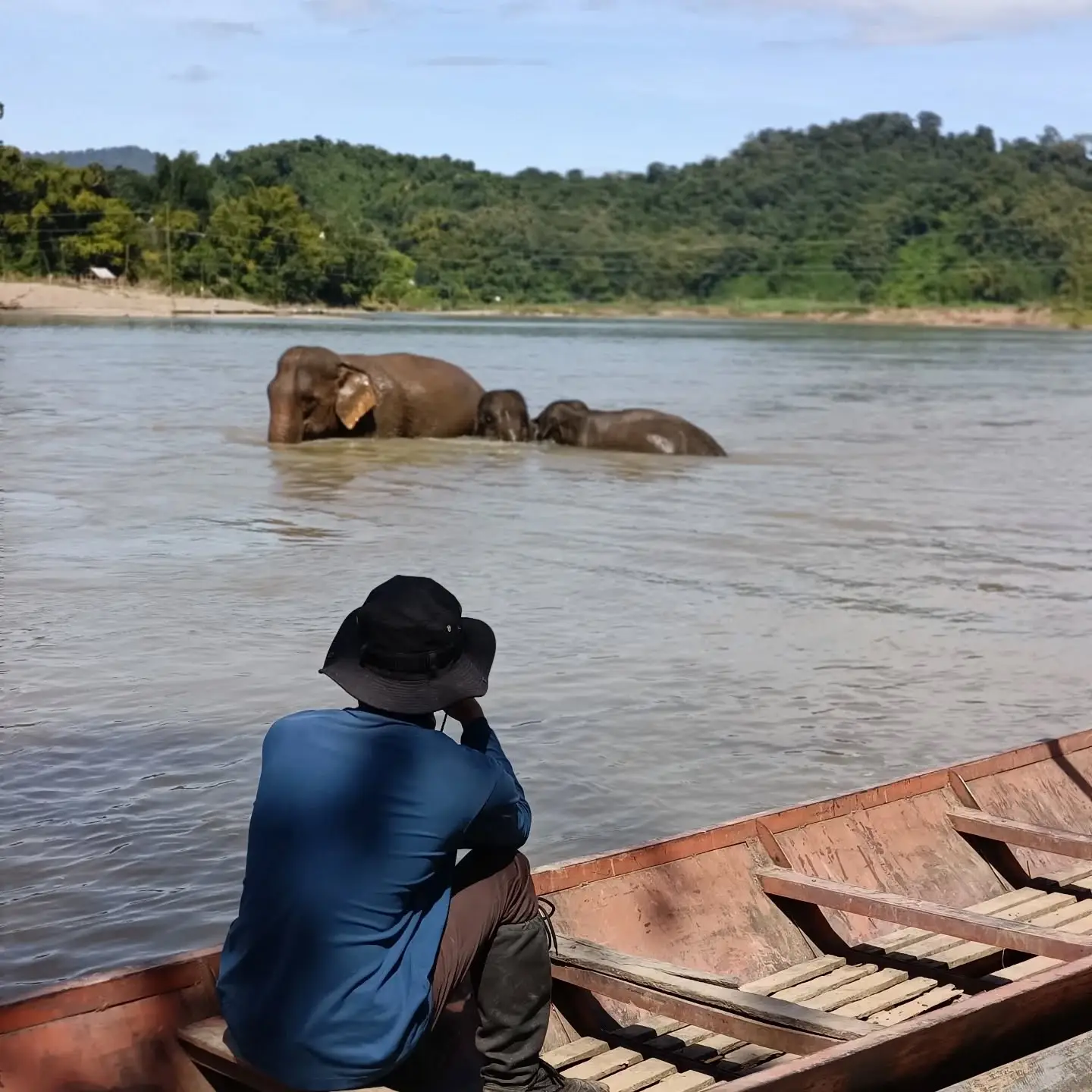 Meet the Elephants: Guests cross the Nam Khan river by longtail boat for the first introduction to our elephants. MandaLao guides introduce guests to our elephants and mahouts, providing background on our elephants. Guests feed the elephants the special treats they prepared for the elephants.